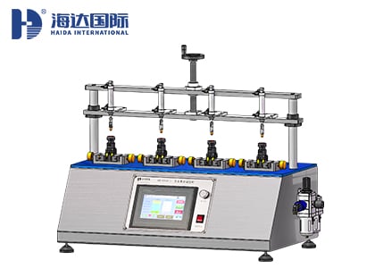 將樣品固定于本機夾具上(帶電測試樣品需要鎖緊快速插頭),扭緊夾具螺桿使樣品固定。不銹鋼迷你氣缸則在調好適當高度情況下,上下往復點動按鈕,直到樣品損壞,記錄點動次數。